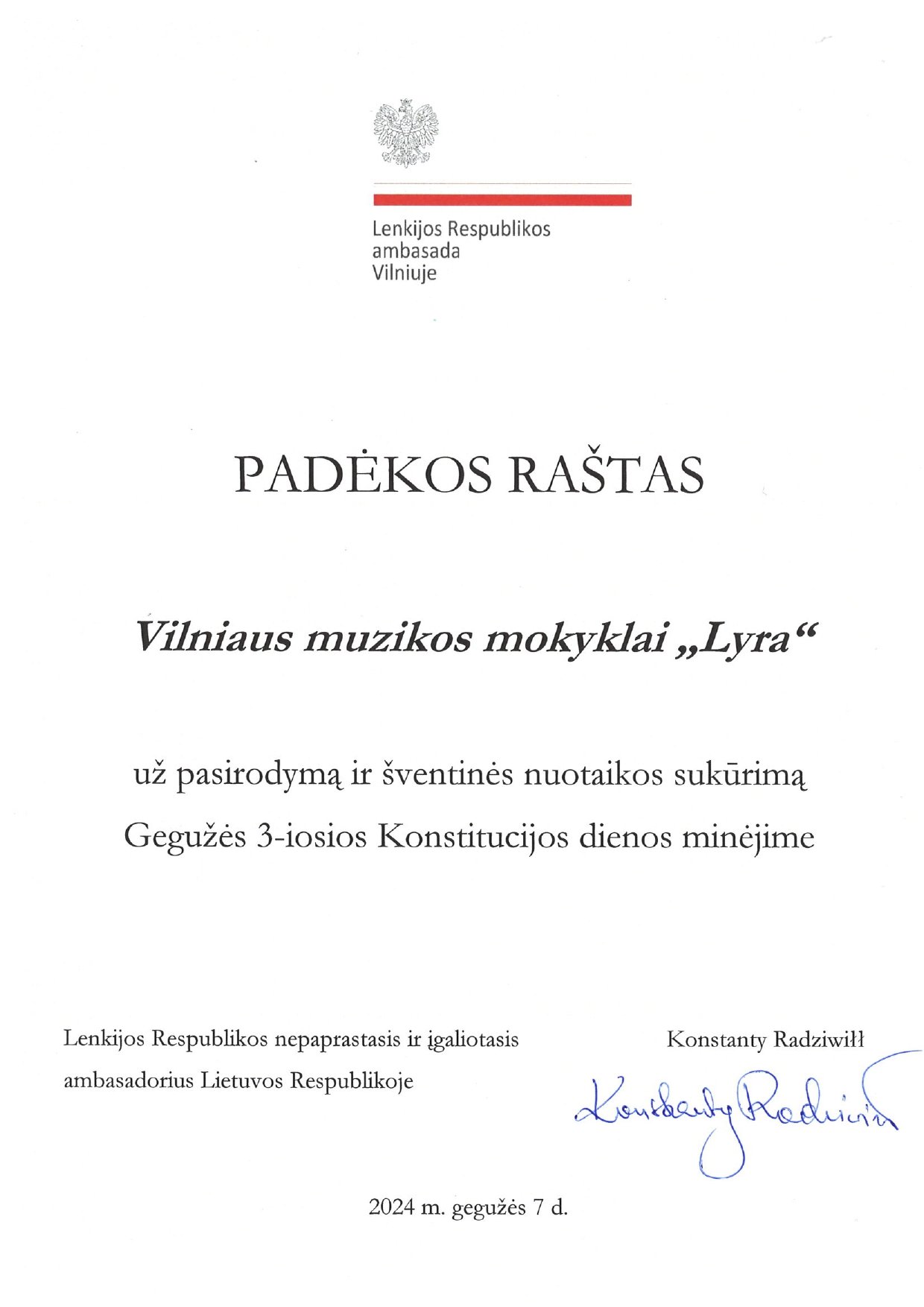 Gegužės 3-osios Konstitucijos dienos proga, Lenkijos Respublikos ambasadoje Vilniuje, vyko iškilmingas priėmimas, kurio metu valstybės apdovanojimais buvo pagerbti asmenys, už nuopelnus plėtojant lenkų ir lietuvių bendradarbiavimą bei už veiklos Lietuvos lenkų bendruomenės labui nuopelnus.
