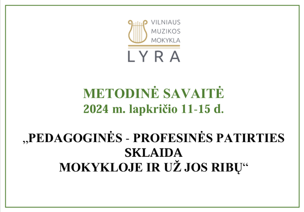 2024 m. lapkričio 11-15 d. muzikos mokykloje „Lyra“ vyko jau ketvirtus metus organizuota metodinė savaitė „METODINĖS-PROFESINĖS PATIRTIES SKLAIDA MUZIKOS MOKYKLOJE IR UŽ JOS RIBŲ“, kuri organizuojama kasmet jau nuo 2021 m.